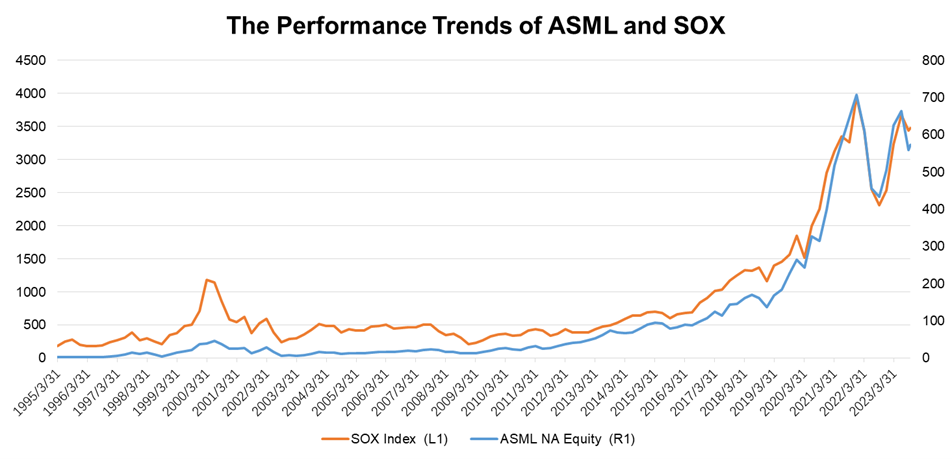 Being an upstream semiconductor equipment manufacturer and considering the relatively extended lead times in photolithography machine manufacturing, ASML's performance lags slightly behind the cyclical shifts. However, in comparison to the Philadelphia Semiconductor Index $Philadelphia Semiconductor Index(SOX)$ , ASML's stock price has closely tracked the index's movements: