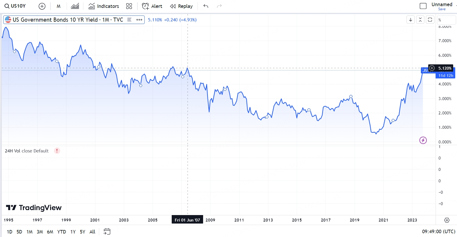 The benchmark 10-year Treasury yield rose to a 16-year high, crossing 5% for the first time since July 20, 2007, reaching as high as 5.029%.