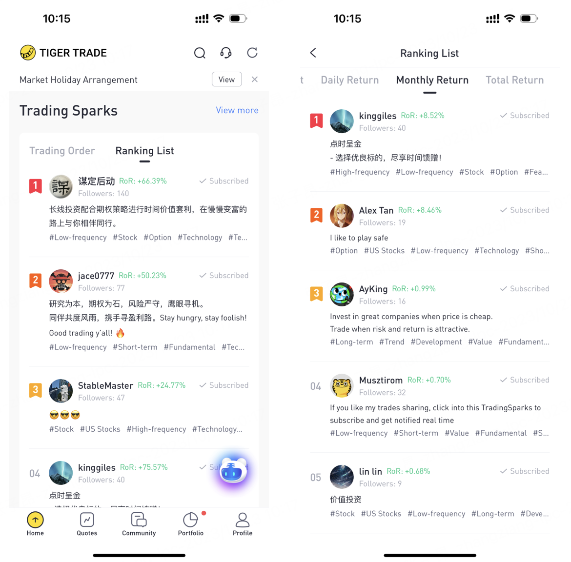 Click on our top 5 performers' IDs to subscribe to their real-time trading & order updates – It's time to spark your trading inspiration!