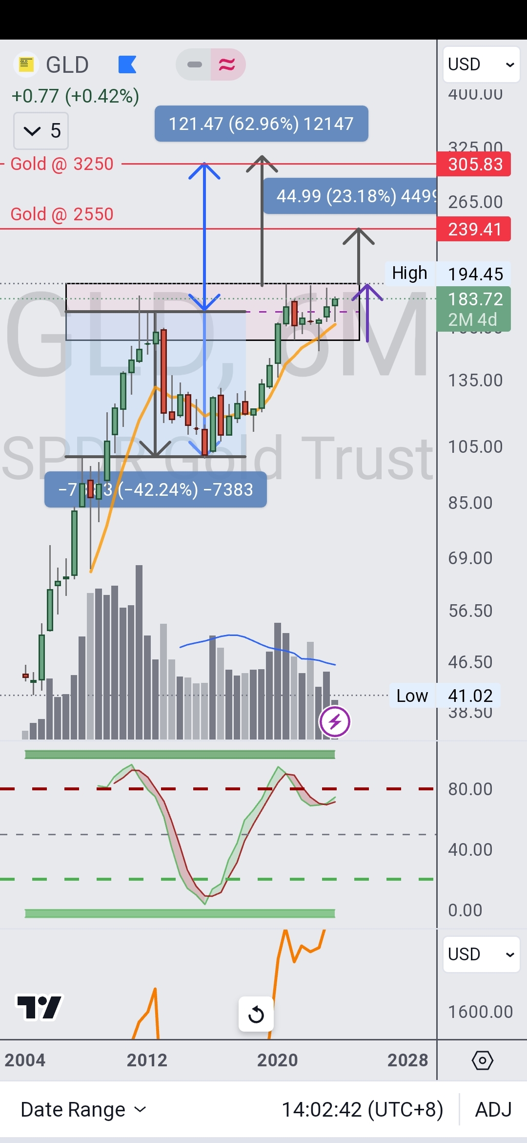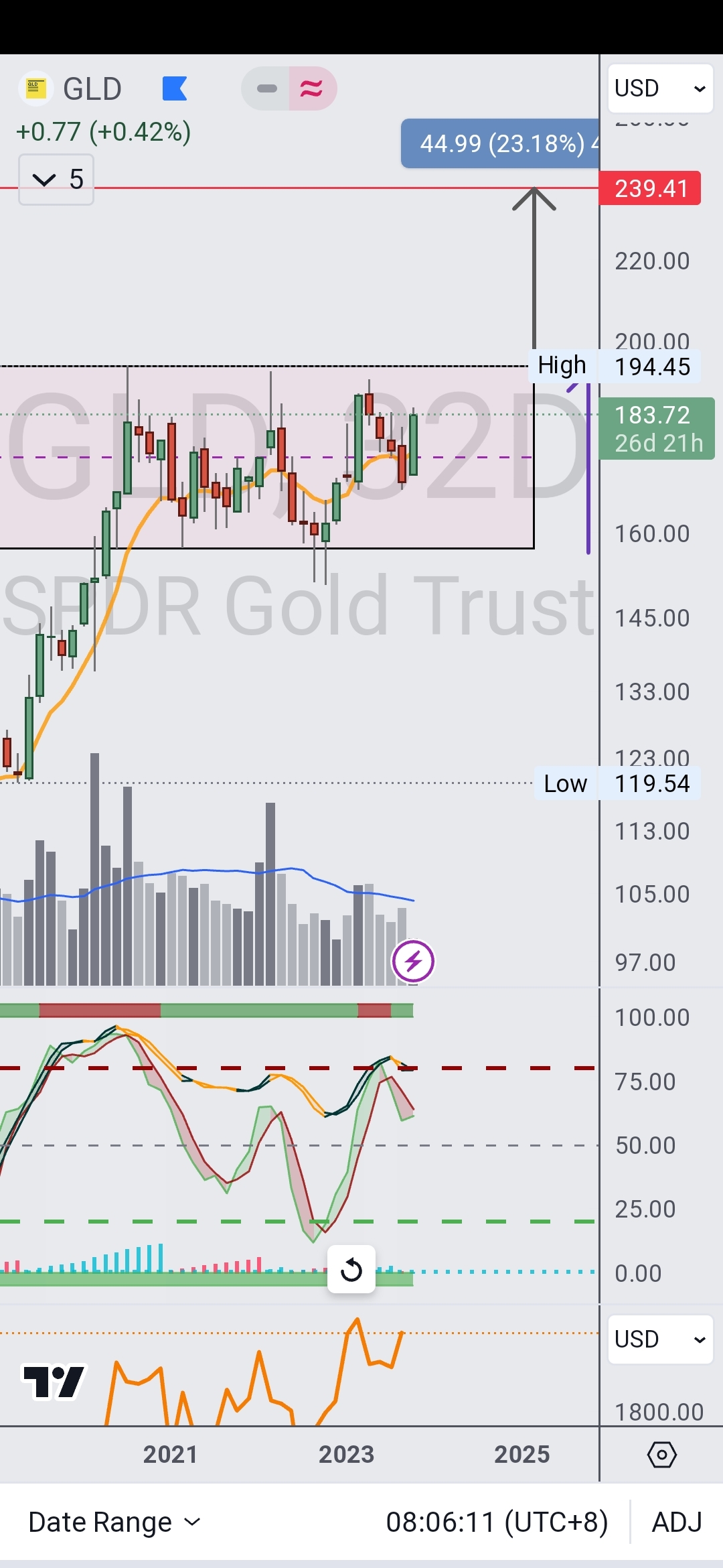 Using GLD as proxie on a 32D chart, we can see the consolidation range and how the highs were not broken, yet the low range was...wyckoff spring. Declining volume while price consolidates being another sign of accumulation.