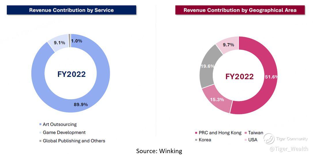 As of FY2022, Art Outsourcing Segment contributed 89.9% to the total revenue, with the remaining 9.1% and 1.0% contributed by Game Development Segment Global Publishing and Other Services Segment respectively.