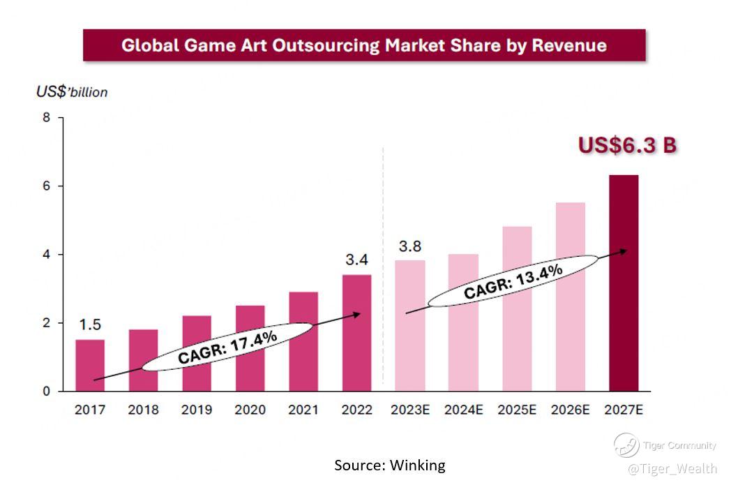 As seen in the latest Apple iPhone15, mobile gaming is expected to receive a strong boost with the powerful A17 Pro silicon and new GPU. This will raise the bar for game graphics, leading to increased spending on game art. As a leading game art outsourcing studio, Winking will be a strong beneficiary of the rise in mobile gaming. The global game art outsourcing industry is already growing rapidly, from $1.5 billion in 2017 to $3.4 billion in 2022, and is expected to grow at 13.4% in the future.