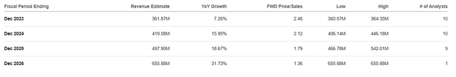 Nevertheless, we have to be completely honest with ourselves and revenue has to reaccelerate again. When we take a look at the revenue estimates from analysts, we can see they expect 2024 and 2025 revenue to come in at $420M and $500M respectively. This indicates that Fiverr is currently trading at only 2.12 times its 2024 revenue.