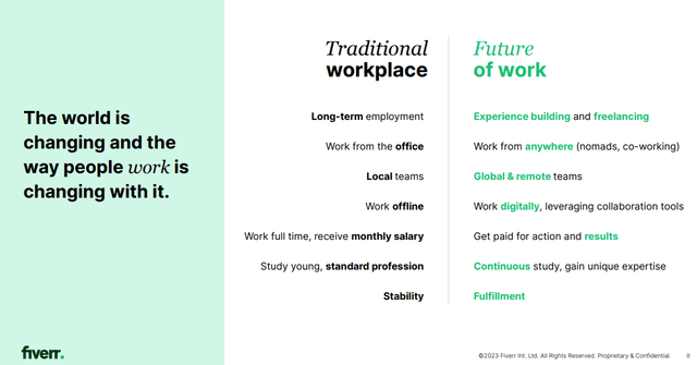 Let's take a quick look at what Fiverr aspires to be and what they believe is the Future of work. I believe this can be best described by taking a look at the slide below from the company's Q2 earnings report.