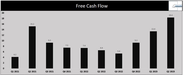 As you can see in the chart below, the FCF the company has been generating since Q3 of 2022 is phenomenal. This corresponds to a CAGR of 35.86% over the last 4 quarters, or an increase of over 240%.