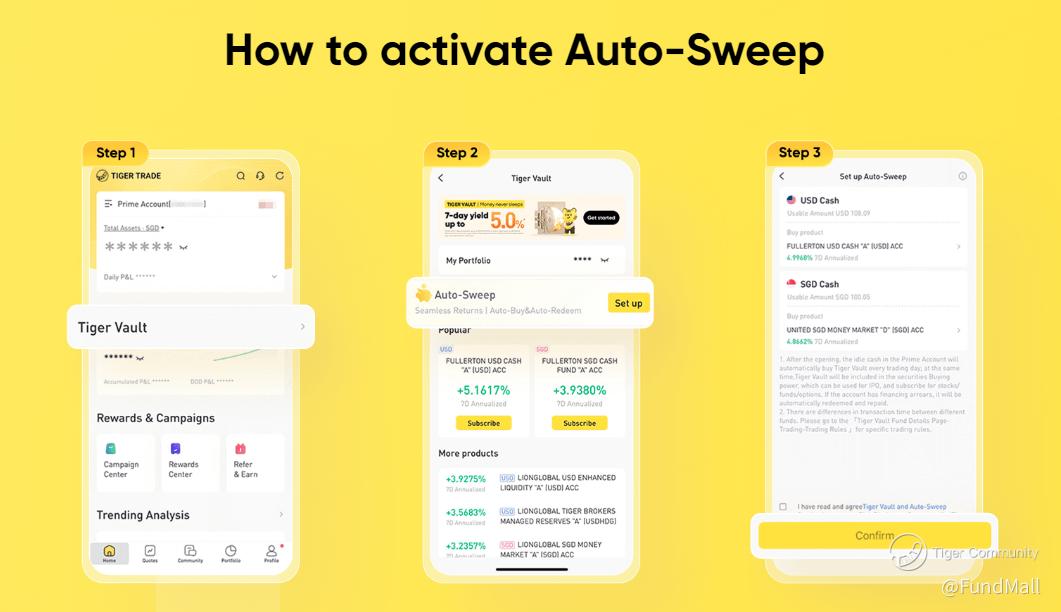 Auto-Subscription: When Auto-Subscription is initiated through the activation of Auto-Sweep, the idle cash in your account will be automatically swept into the Tiger Vault fund of your choice to work hard for you.