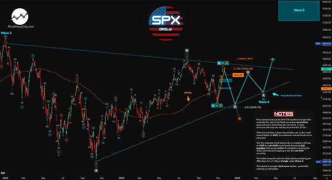 $S&P 500(.SPX)$ remained above 4375 then extended the B-Wave to the secondary 4500 termination target.