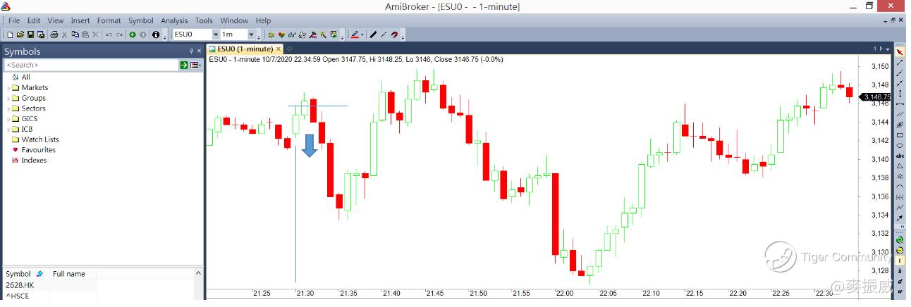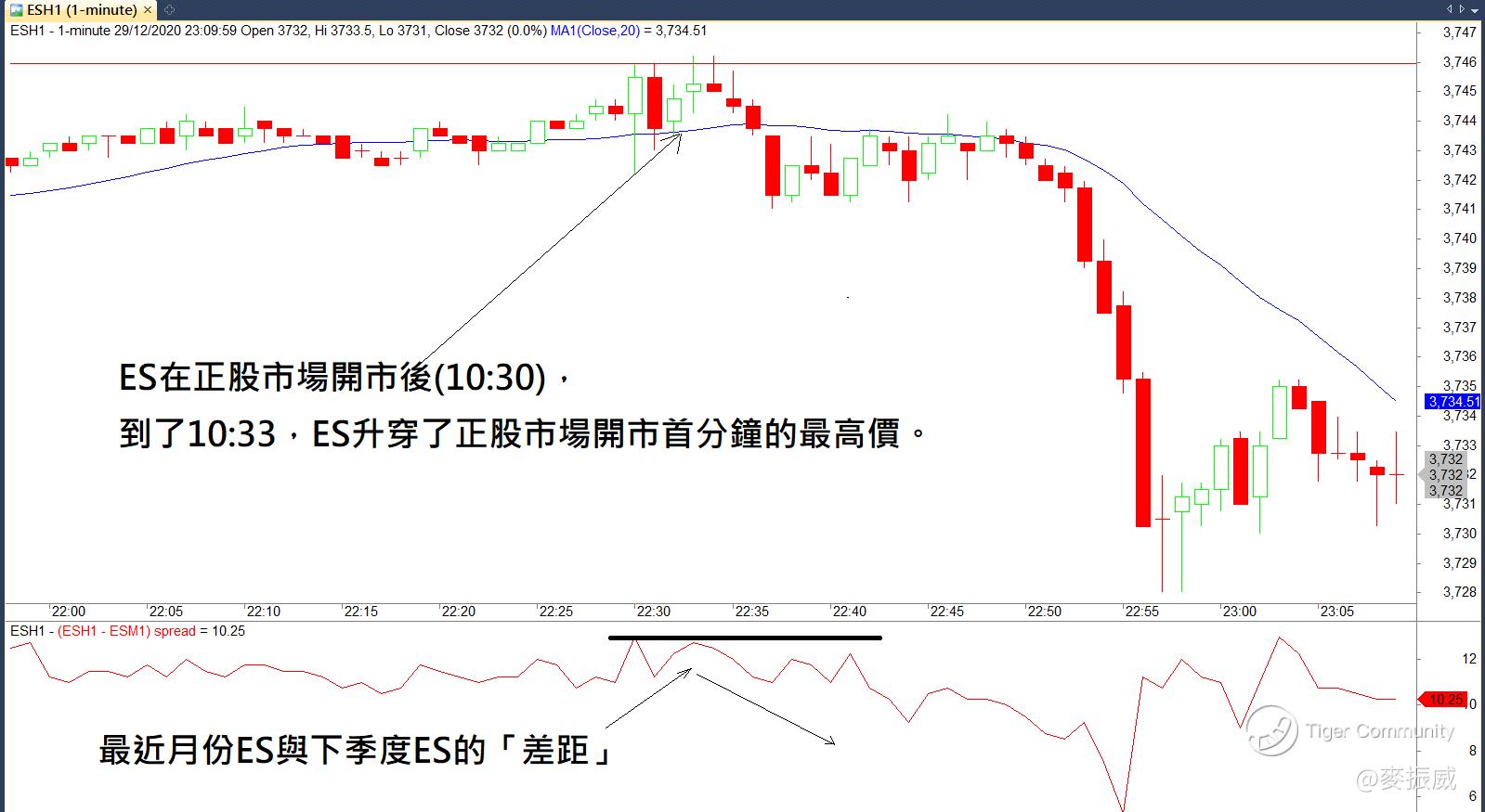 上圖中,ES在正股市場開市後(10:30),到了10:33,ES升穿了正股市場開市首分鐘的最高價,若根據美期的特性,升穿正股市場開市首分鐘最高價後,很快也會出現調整,若比較「最近季度與下季度的ES差價」,大家可看到,差價在價格上升之時,差價擴大的幅度其實不大,即使價格升穿了正股開市首分鐘的最高價,但差價也沒有同步創新高,這代表了上升的力度其實有限。