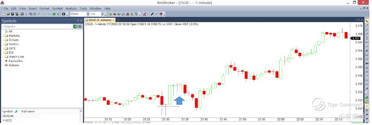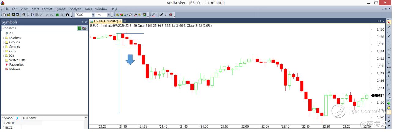 瞭解這個特性後,若用1分鐘圖表來觀察本港期指的走勢,會發現若價格先升穿「正股市場開市後首分鐘的最高價」,很多時候也會很快回落,然後再跌穿「正股市場開市後首分鐘的最低價」。