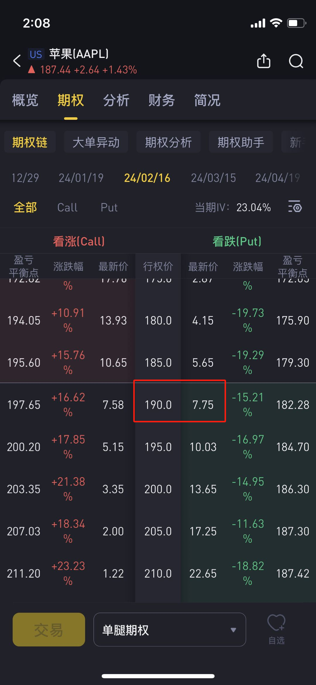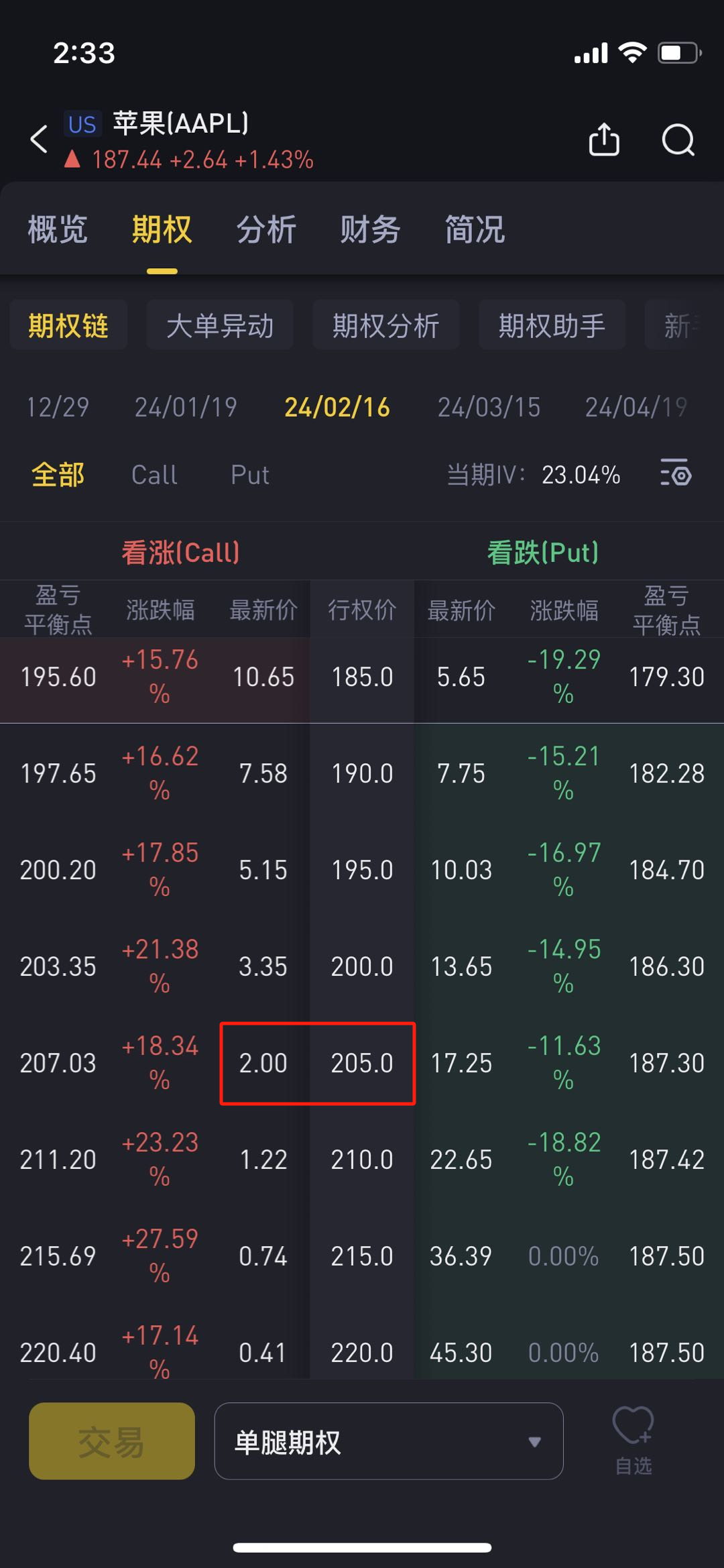 Firstly, there is the issue of the strike price for the sold call option. If we choose a call option with a strike price of $205 expiring on February 16, as before, each contract generates a premium income of $2, with a delta coefficient of 0.216. Each unit combination is composed of one share of stock and five call option contracts."