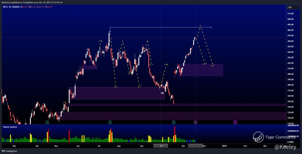 Price filled the fair value gap at 346.37 and did not respected the bullish OB at 375.87 according to my last analysis. However, if you've been following my analysis, you would have expected a bounce off the gap. Price is on a nice bullish momentum and has filled the fair value gap at 459.25 made in July. Right now, I'm expecting price to (1) make a bearish retracement, back into the bullish OB at 418.84, or (2) take out the highs at 485.00 and then follow the analysis in (1).