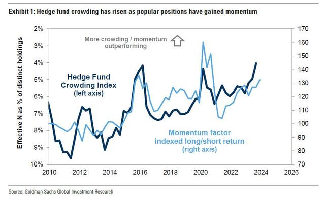 Goldman Sachs noted that rising hedge fund concentration as investors chase trends and strong performance from popular stocks have supported returns this year, but at the same time pushed the crowding index to a record high.