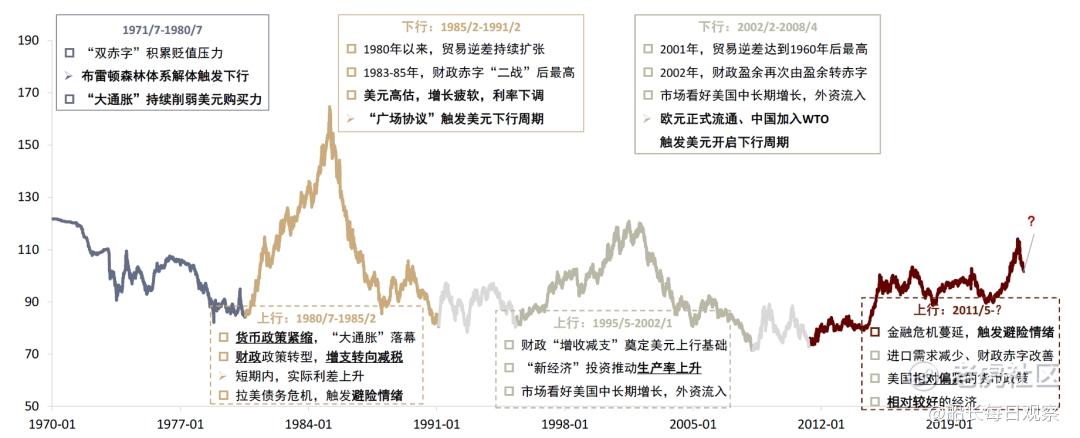 (因美國內部的貿易/財政雙赤字突破界限,美元指數相對美元平價購買力的高溢價見頂,疊加日元正常化/歐元反轉/新興市場工業化等長期外部壓制,或由某個標誌性事件顯著引發美元長熊週期。內部極度失衡+外部壓力反轉+導火索)