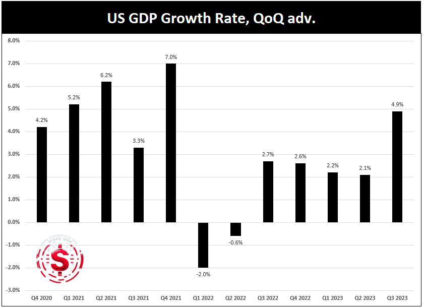 The Gross Domestic Product (GDP) is also on the upswing, especially in the third quarter of 2023, where the real GDP shot up at an annual rate of 4.9%. This significantly improved from the 2.1% increase in the second quarter.