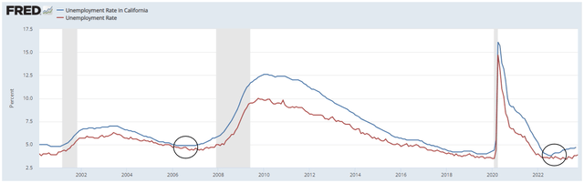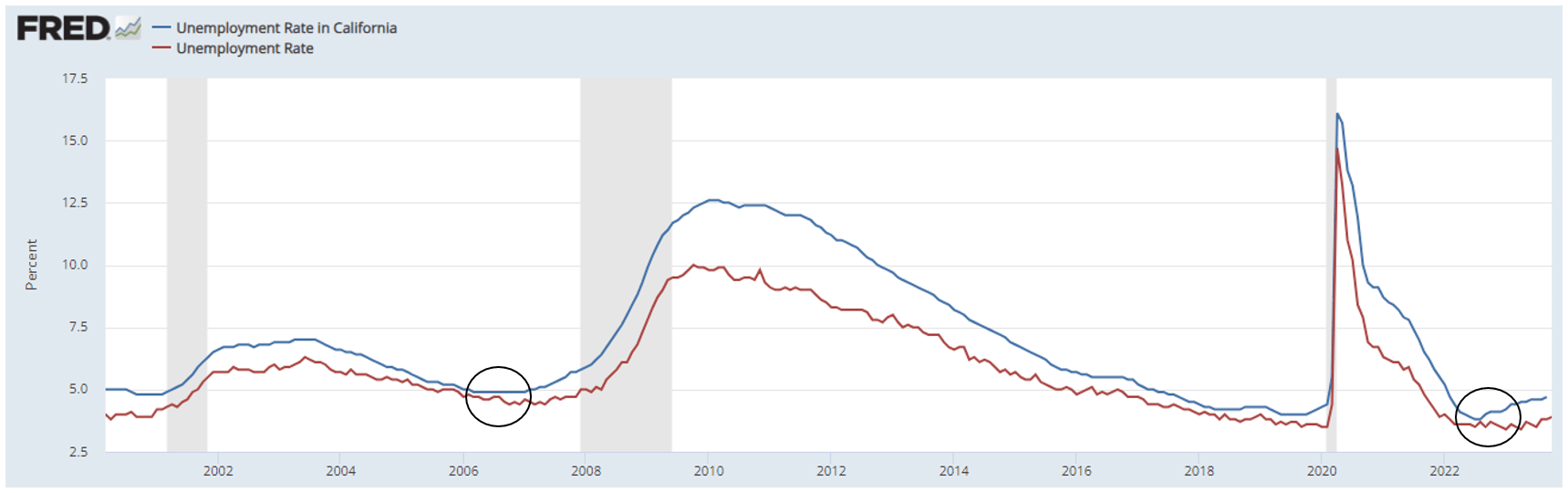 If we draw parallels to the last time the FED set interest rates as high as now, it would seem as though unemployment in the US as a whole lags that of California. If that is the case again, we may see overall unemployment rise.