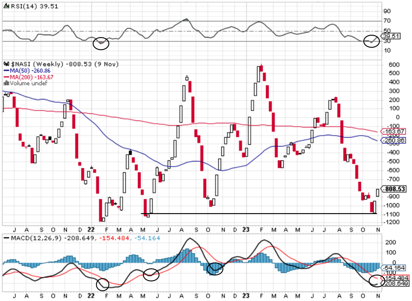 In the past two years, the $NASI, combined with the RSI and MACD indicators, have shown some relatively strong bottoms in the market.