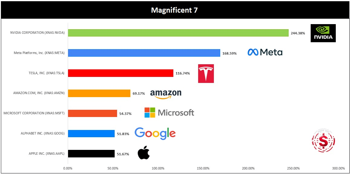 Even Apple (AAPL), Alphabet (GOOGL), Microsoft (MSFT), and Amazon (AMZN) had returns of over 50% year-to-date. It is pretty clear that the so-called "Magnificent 7" carried the index.