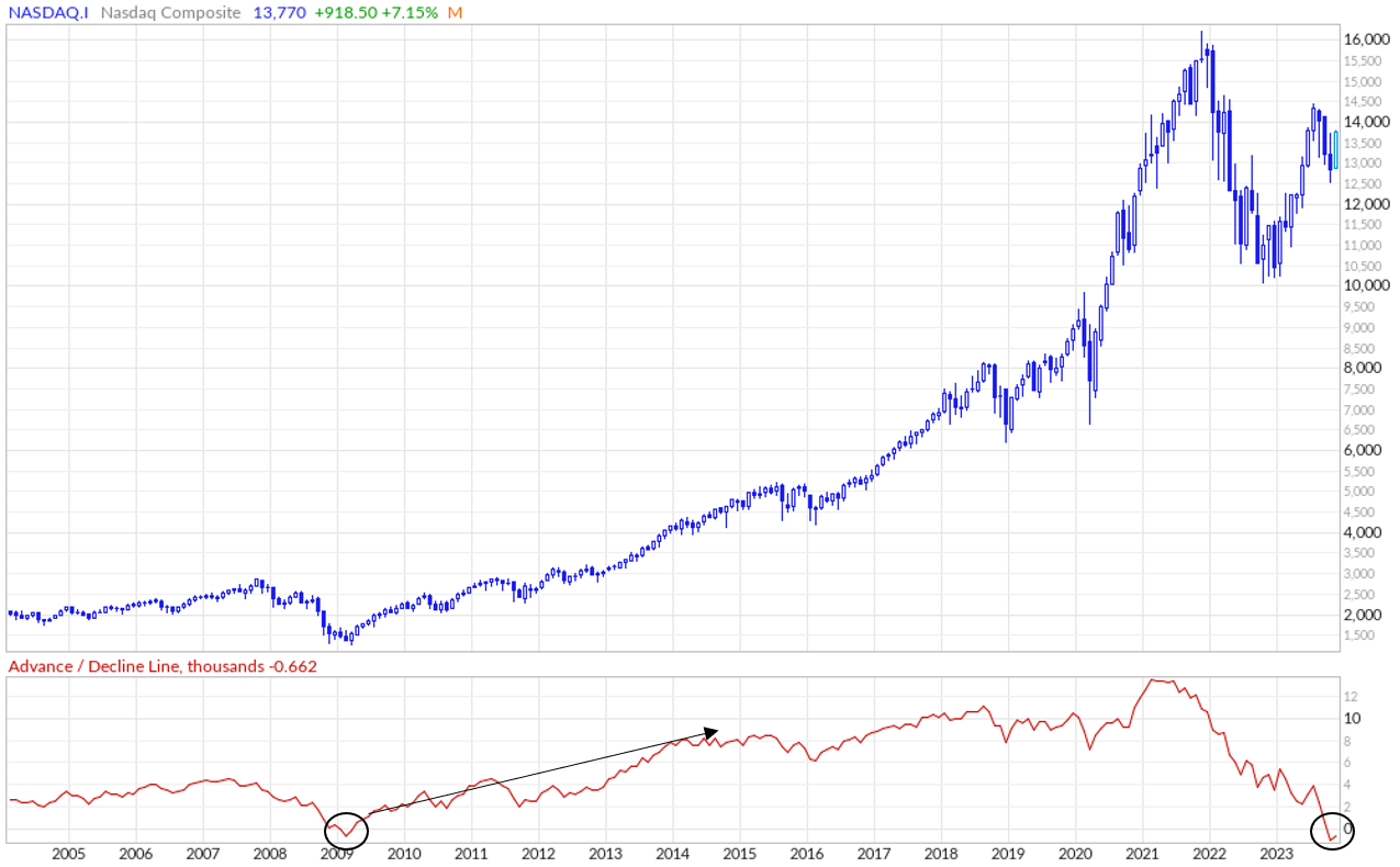 Next, we want to zoom out and look at market breadth on a much bigger scale. We look at the Advance/decline line (AD line) on the Nasdaq for this.
