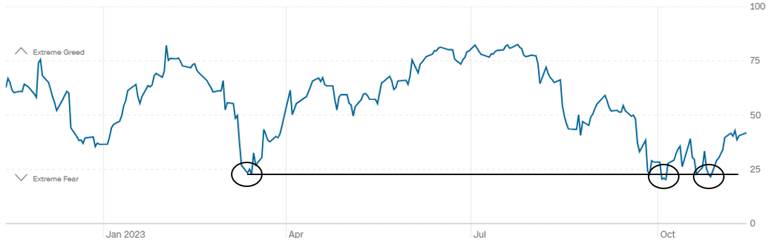 If we look at historical measurements of the Fear and Greed Index, we see that we measured below 25 twice in October and at the same level as back in March of this year. This underscores our thesis about a possible bottoming out on the market.