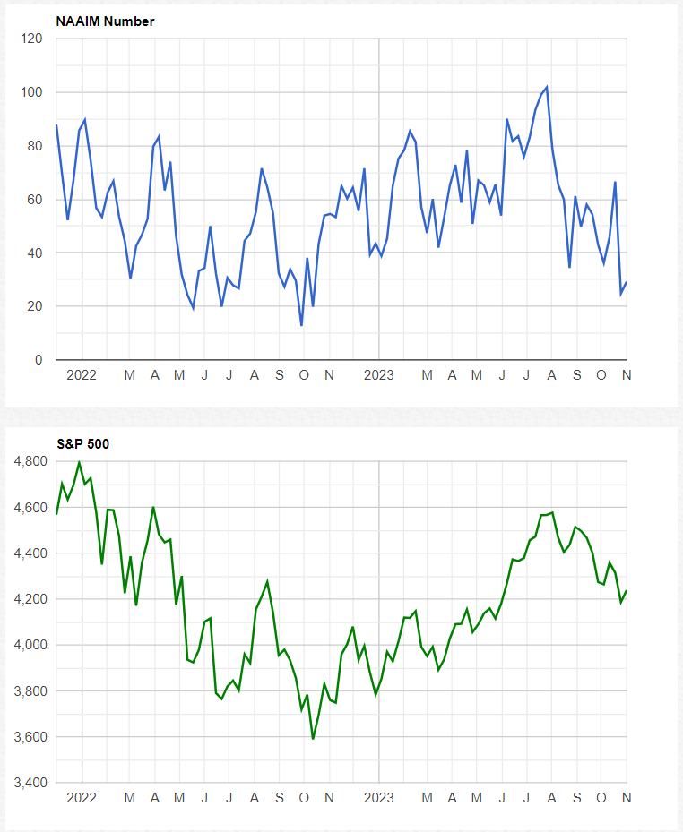 The last graph we want to show is the National Association of Active Investment Managers (NAAIM) index, which shows the average exposure of US equities reported by association members. It is a valuable tool to stay updated and in tune with how active investment managers adjust twice weekly.