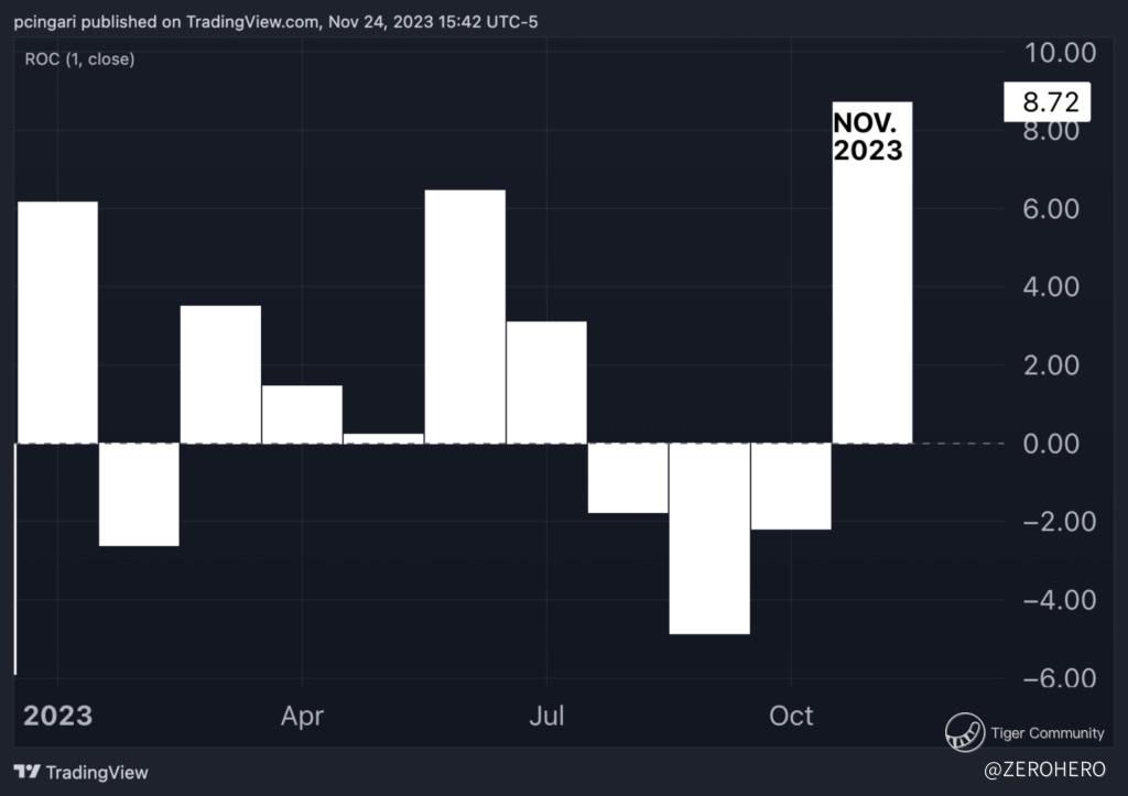 The S&P 500 index has experienced an impressive 8.7% increase thus far in November, marking its strongest monthly performance since July 2022. Looking at the returns in November, the last time the S&P 500 boasted such a robust gain in this month of the year was in 1980 when it rallied by 10.2%. Friday saw major U.S. averages closing out their fourth consecutive week in the green, signifying the longest winning streak since June of the same year.