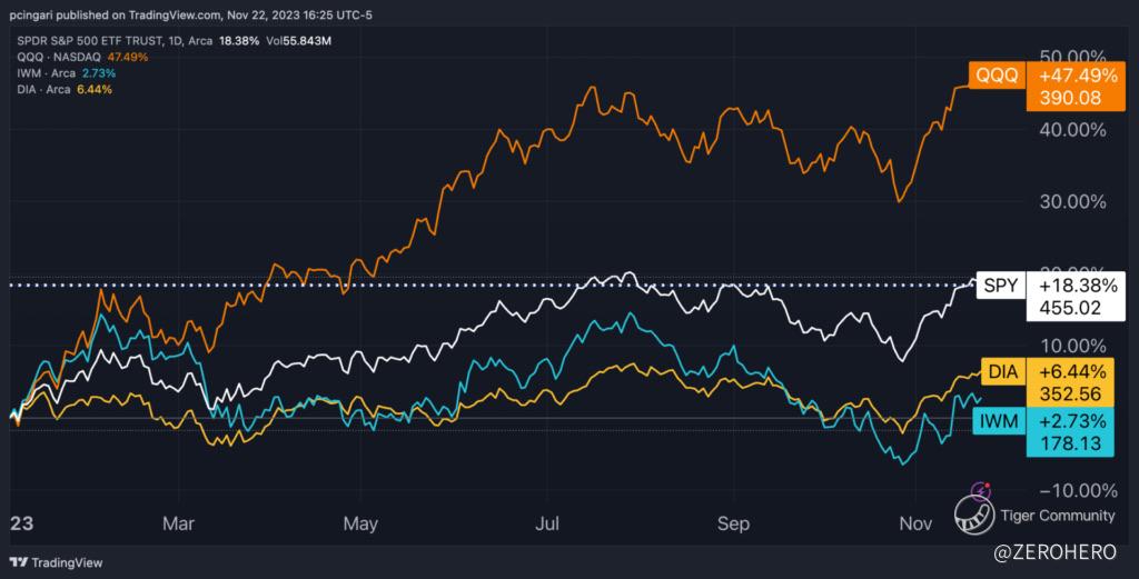 Notably, the SPDR S&P 500 ETF Trust (NYSE:SPY), the largest exchange-traded fund tracking the S&P 500, has generated returns of 18% year-to-date, nearly doubling the 30-year yearly average for the index, with more than a month still left in the year. Tech stocks have outperformed even further, with the Invesco QQQ Trust (NASDAQ:QQQ) surging by 45% year-to-date.