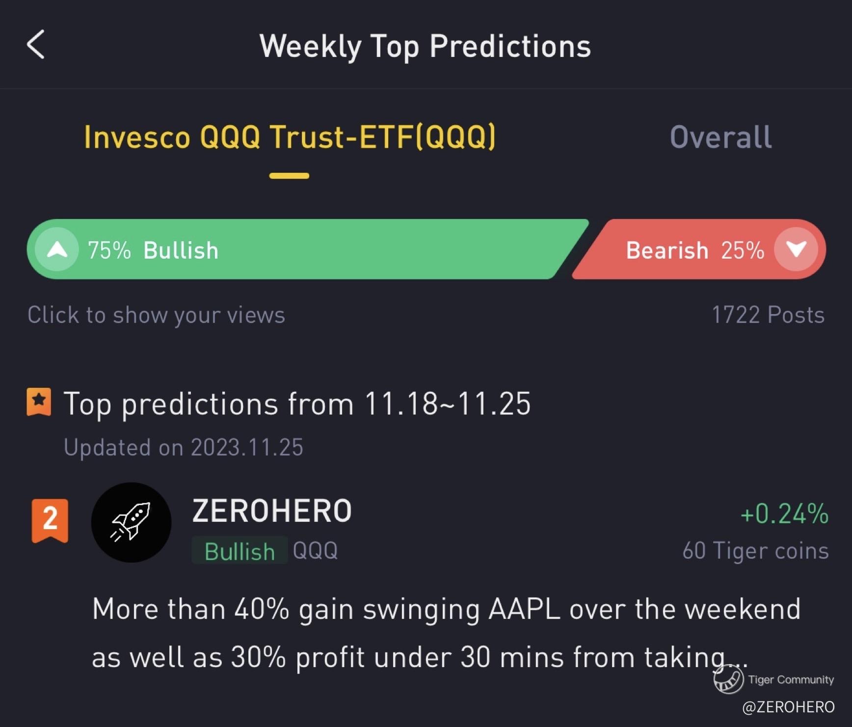 Thanks to Tiger for awarding the weekly top prediction for QQQ. The Thanksgiving week has historically been a period of thinner trading volumes due to fewer market participants. This can lead to lower liquidity and, in some instances, heightened volatility.