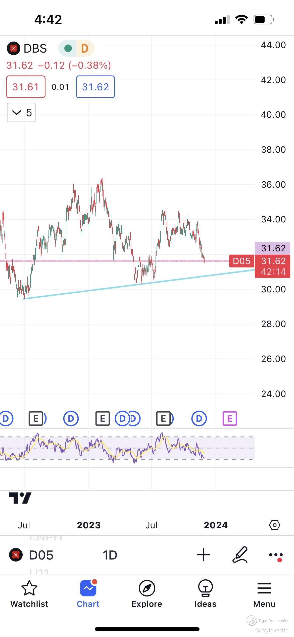 From my analysis, DBS is unlikely to fall below 30.50 from a trendline drawn all the way from June'22. In fact, it has been making higher lows. Price at 31.60 was a previous resistance and could serve as a support right now and bounce off from here.