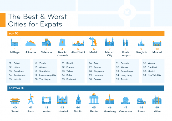 In the list corresponding to 2023, Malaga has achieved first place, rising this year as the best city to live as an expatriate. Two other Spanish cities complete the top 3. These are Alicante and Valencia, in first and second place, respectively. According to the publication, the first stands out for the affordability of housing and the second for the health care it offers. In the top ten positions on the list there is another Spanish city, Madrid, which occupies sixth position. Latin America is also represented in the top 10 of the ranking, with Mexico City, which is positioned as the seventh favorite for expatriates worldwide.
