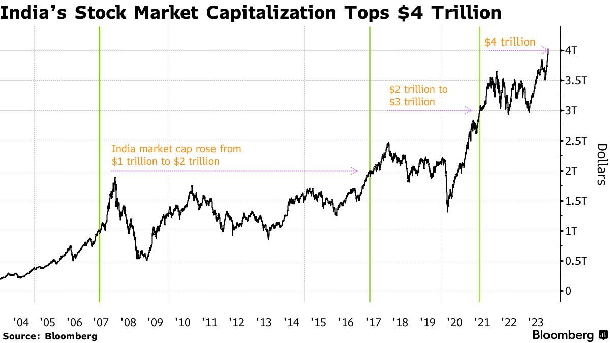 On Dec. 6th, the market cap of the India stock market surpassed $4 trillion, ranking only behind the United States, China, and Japan.