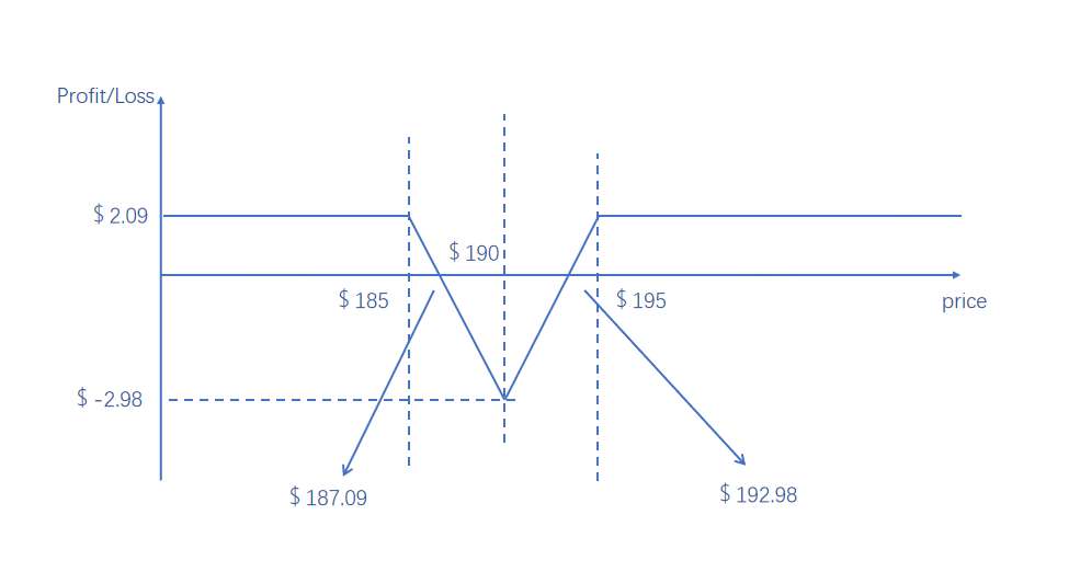 Stock price is between $185 and $195: The lowest point of profit in this scenario occurs at the $190 strike price. Firstly, the call option sold at $185 will be exercised, incurring an exercise loss of $5. Secondly, the two call options bought at $190 will not be exercised, and the call option sold at $195 will not be exercised either. Therefore, the combination's net premium income remains $2.09 (6.56+0.33-2*2.4), resulting in a final net loss of $2.98 ($5-2.09).