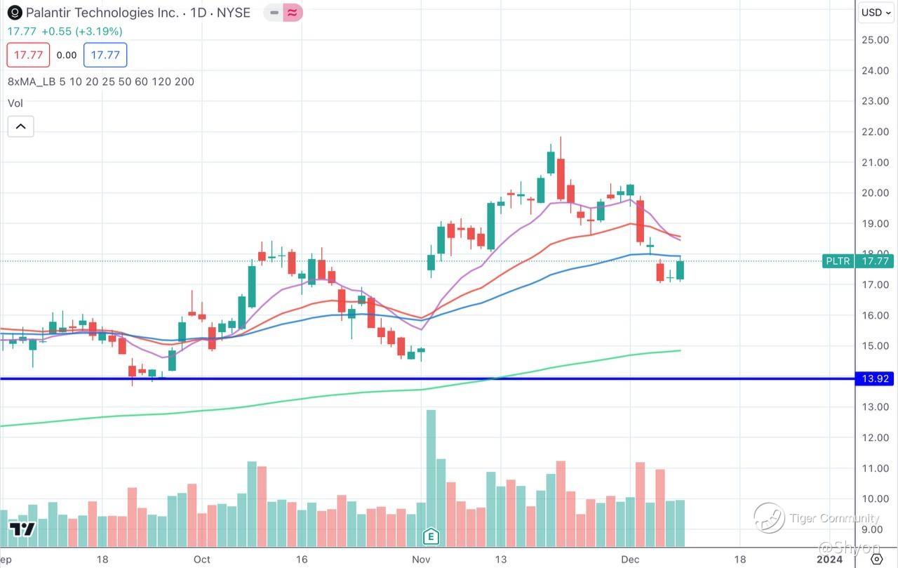 How about PLTR? The stock had been doing extremely well after its recent earnings release. The stock continued to rally until end of Nov where it retraced and now trying to close the previous gap up. In overall, the trend is still healthy although the momentum becomes weaker as the candle stays below EMA50 support. Anyway, we saw some good sign this Friday, as the stock seems to find its bottom and a reversal is to be expected. Let's monitor this next week $Palantir Technologies Inc.(PLTR)$