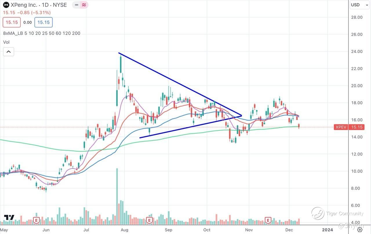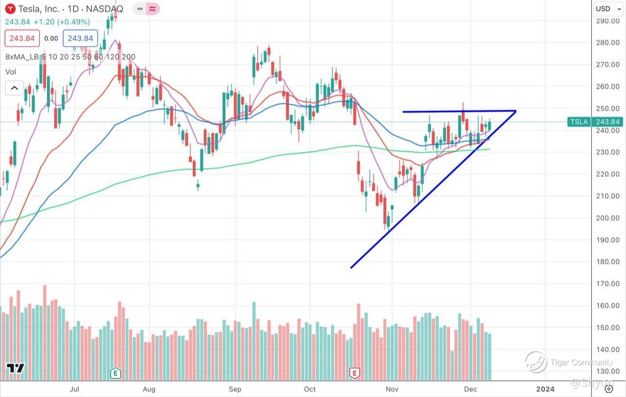 Let's start with the king, the leader in the industry! What a great news to see Tesla being able to sustain above the EMA200 trend line. As shown in the figure below, an ascending triangle pattern is in formation and I think a breakout is very possible by end of next week. The worst should be over for Tesla, a$Tesla Motors(TSLA)$