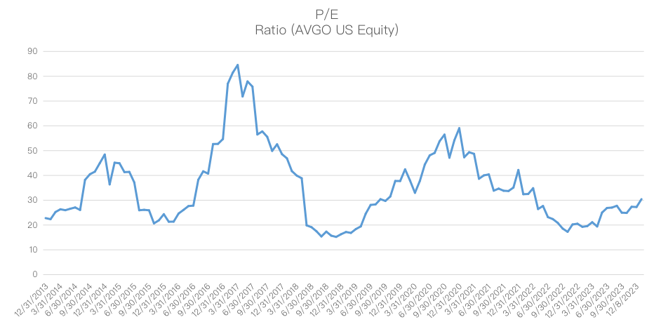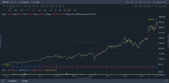 From a price-to-earnings perspective, the valuation has reached 30 times after the significant surge. Considering the company's growth and the long-term profit from integrating VMware, a Broadcom at $1000 is certainly not the peak moment: