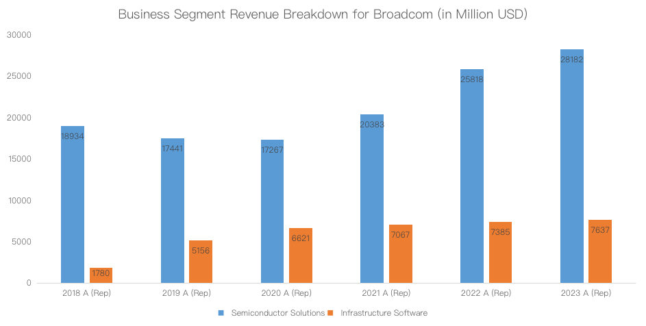 From the revenue structure perspective, Broadcom primarily operates in semiconductor solutions and infrastructure software. The former encompasses 25 product categories, classified into five major groups: broadband, networking, wireless, storage, as well as industrial and automotive. This includes products such as set-top boxes and modems for broadband operations, Ethernet switching chips for data centers, RF front-end modules and FBAR filters for mobile devices, RAID controllers for storage, and motion control products for industrial and automotive applications among the 25 categories. The latter mainly includes mainframe software, network security, and FC SAN storage.