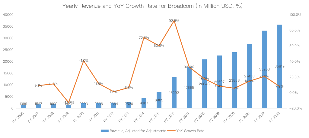 Looking at the historical revenue, Broadcom has demonstrated exceptional growth, achieving a staggering compound annual growth rate (CAGR) of 30.4% over the past decade: