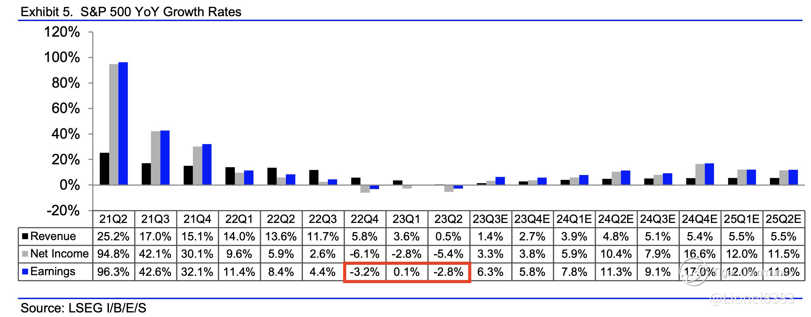 Looking back at S&P 500 earnings for the past quarters, you can see that earnings growth was negative from 2022Q4 to 2023Q2, and from then onwards earnings growth is expected to be positive.