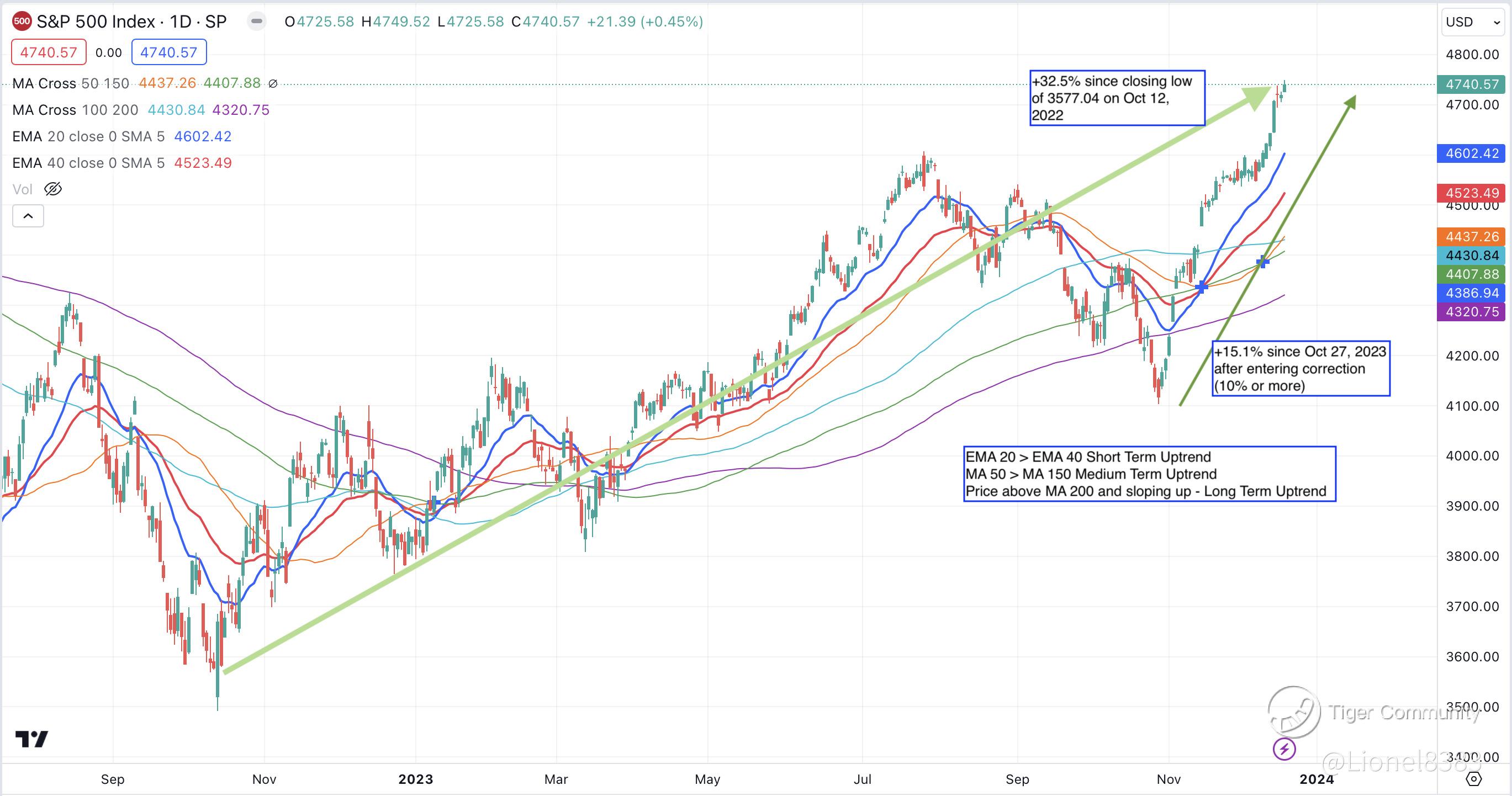 Then we had the usually summer fade away after market peaked on July 31, 2023 at 4,588.97 points, the S&P 500 entered correction territory on October 27, 2023 at a closing low of 4,117.36. And the bears again warned that the market was going to crash as the US 10 year yield was topping 5%. Since it entered correction, the market as of Monday December 18, 2023 close has gained 15.1%.