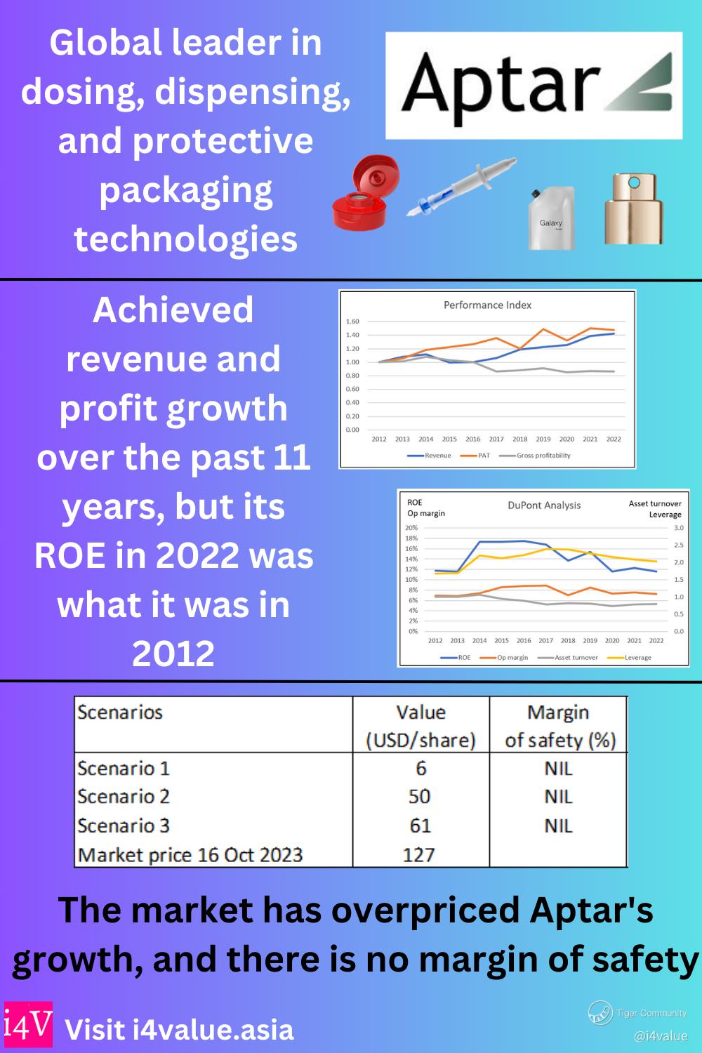 Aptar is a US packaging company that is global leader in drug delivery, consumer product dispensing, and active material science solutions. It achieved revenue and profit growth over the past 11 years, but its ROE in 2022 was what it was in 2012. This was because its operating efficiencies have been declining