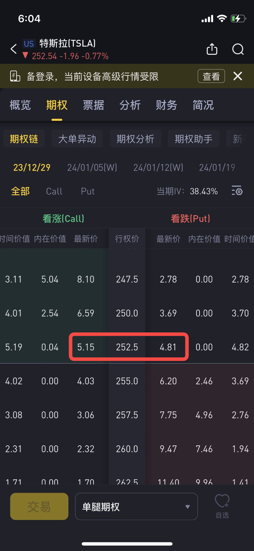 For example, if we believe that Tesla's stock price will rise before December 29th, we can buy a call option with a strike price of $252.5 while simultaneously selling a put option with the same strike price. The expiration date is set for December 29th. The net premium paid is $0.34 ($5.15 - $4.81).
