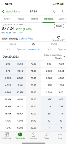 $BABA it’s too obvious that it’s going to be down tomorrow and quite a lot, look at the options chain tomorrow and think for yourself…do you think that the MM would rather pay out 11000 calls at the $77 strike or maybe they rather payout 820 puts, same goes for the $76 and the $75 strikes!!!! To the moon right????