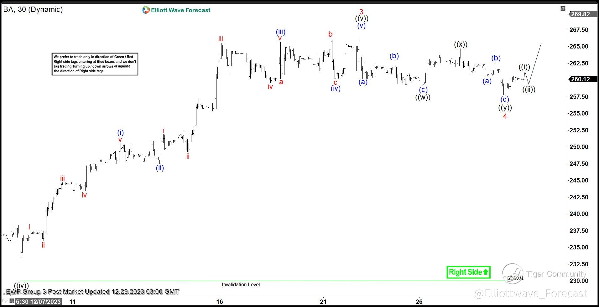 Short Term Elliott Wave View in Boeing (BA) suggests rally from 10.27.2023 low is in progress as a 5 waves impulse. Up from 10.27.2023 low, wave 1 ended at 197.14 and pullback in wave 2 ended at 189.57. The stock then resumed higher in wave 3. Up from wave 2, wave ((i)) ended at 211.09 and pullback in wave ((ii)) ended at 204.81. Boeing then extended higher in wave ((iii)) towards 239.23 and dips in wave ((iv)) ended at 230. Final leg wave ((v)) higher ended at 267.54 which completed wave 3. The 30 minutes chart below shows the rally from wave ((iv)).