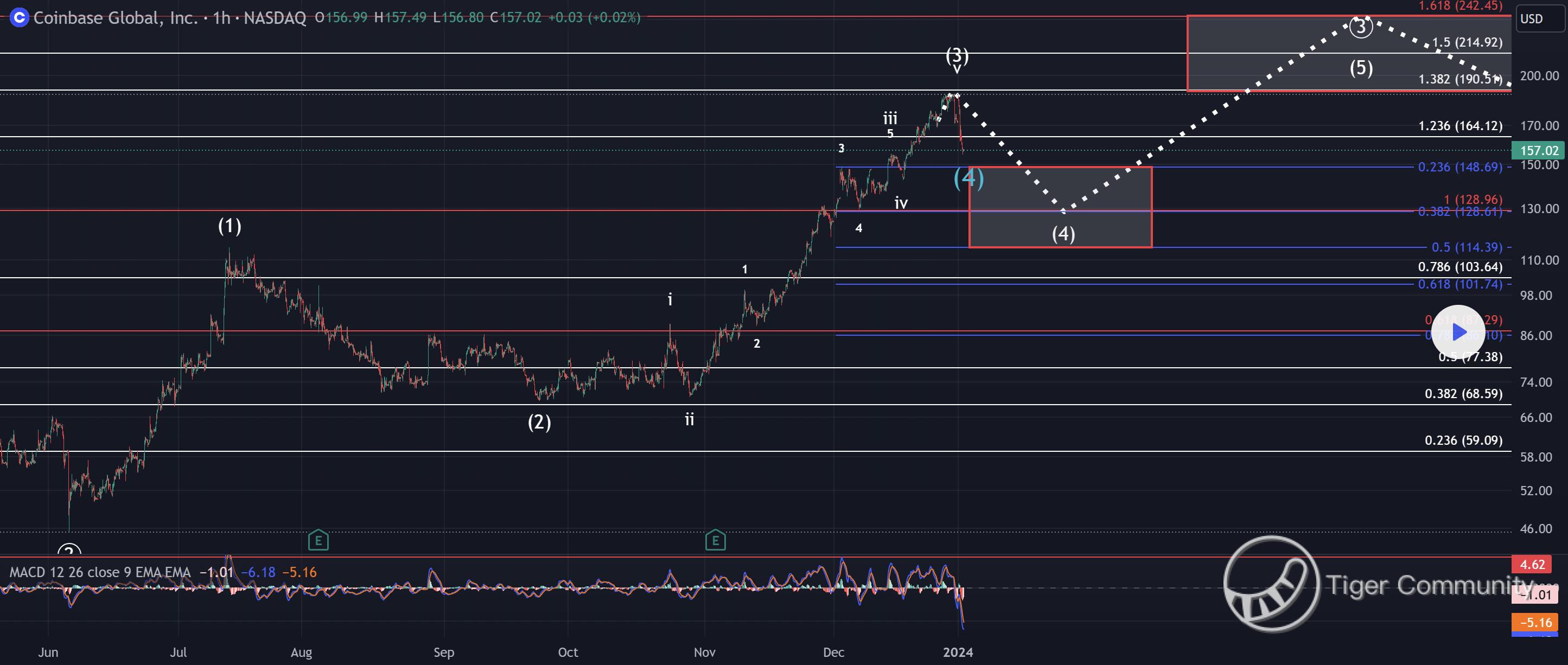 I expect this move to continue down towards the 0.382 blue fib @ $128.61 before moving up again. Once (4) is over, we should move higher to my next box in the $190 to low $200 area at a minimum.