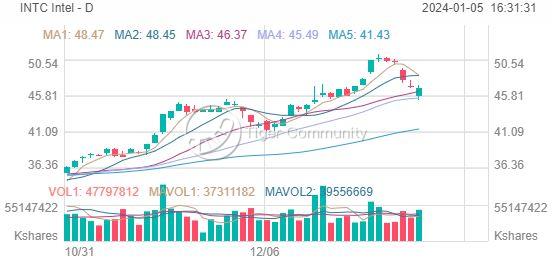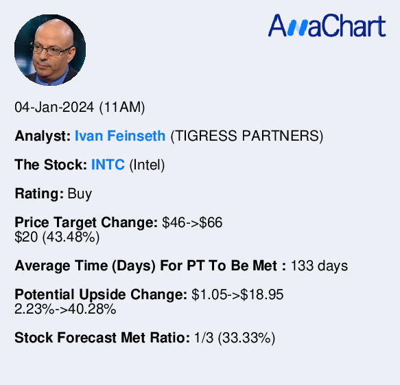 #TIGRESSPARTNERS analyst Ivan Feinseth who covers $Intel(INTC)$ has the current 5th biggest price target movement on AnaChart (04-Jan-2024 (11AM)) by upgrading from $46 to $66 with an increase in potential upside change from $1.05(2.23%) to $18.95(40.28%) with a rating of Buy.