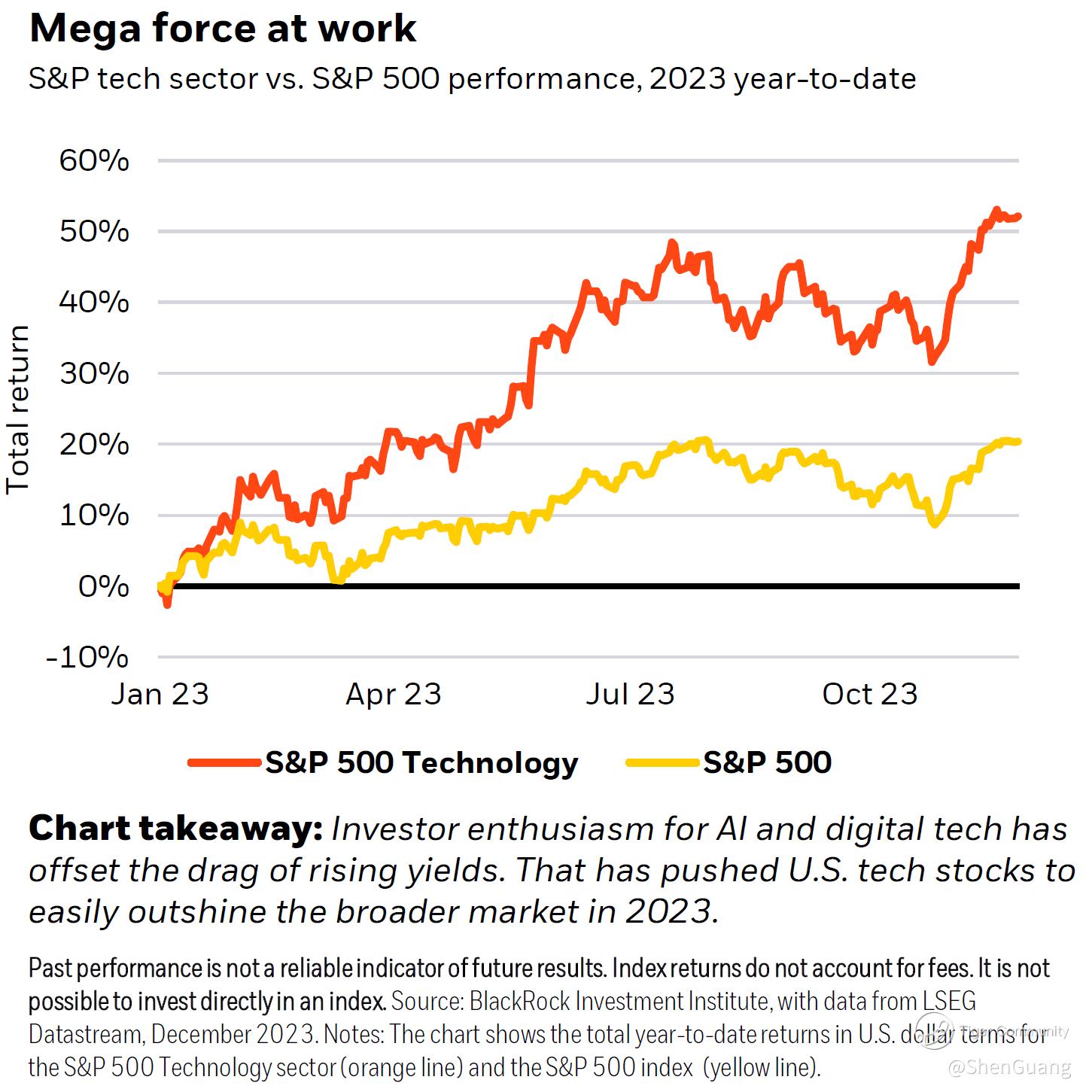 The drop in consumption is a particularly ominous indicator for the technology sector: without significant buy-ins, forward valuations and investor convictions get shaky. As the Blackrock Investment Institute indicated, "tech" enjoyed a conviction premium throughout 2023 and ended the year with a nearly 155% outperformance against the "broad market".