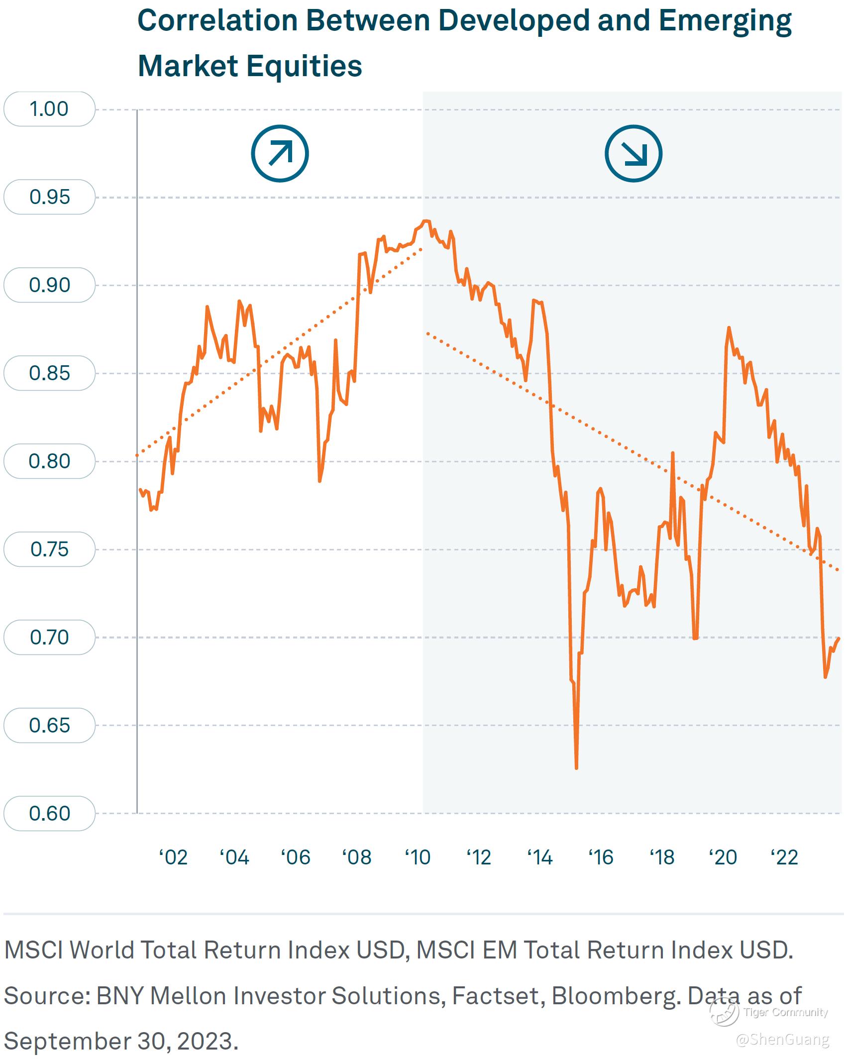 Another assumed truism is that an "American" recession tends to spell doom for the global market and economy as well. In its outlook for 2024 titled "10-Year Capital Assumptions", BNY Mellon outlines that this may not happen. After a high water mark around 2010 – itself marking the last significant recessionary event (the Global Financial Crisis (GFC) – Emerging Markets (EM) have been increasingly uncoupled from Developed Markets (DM).