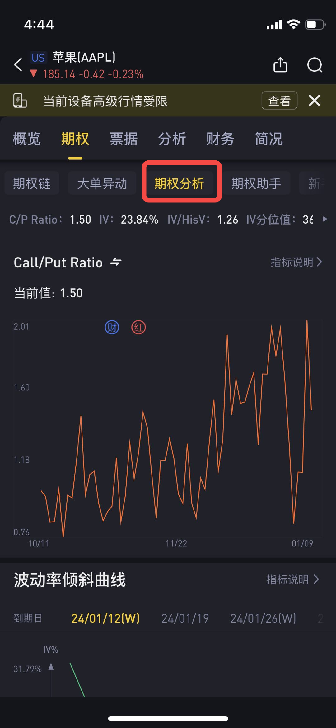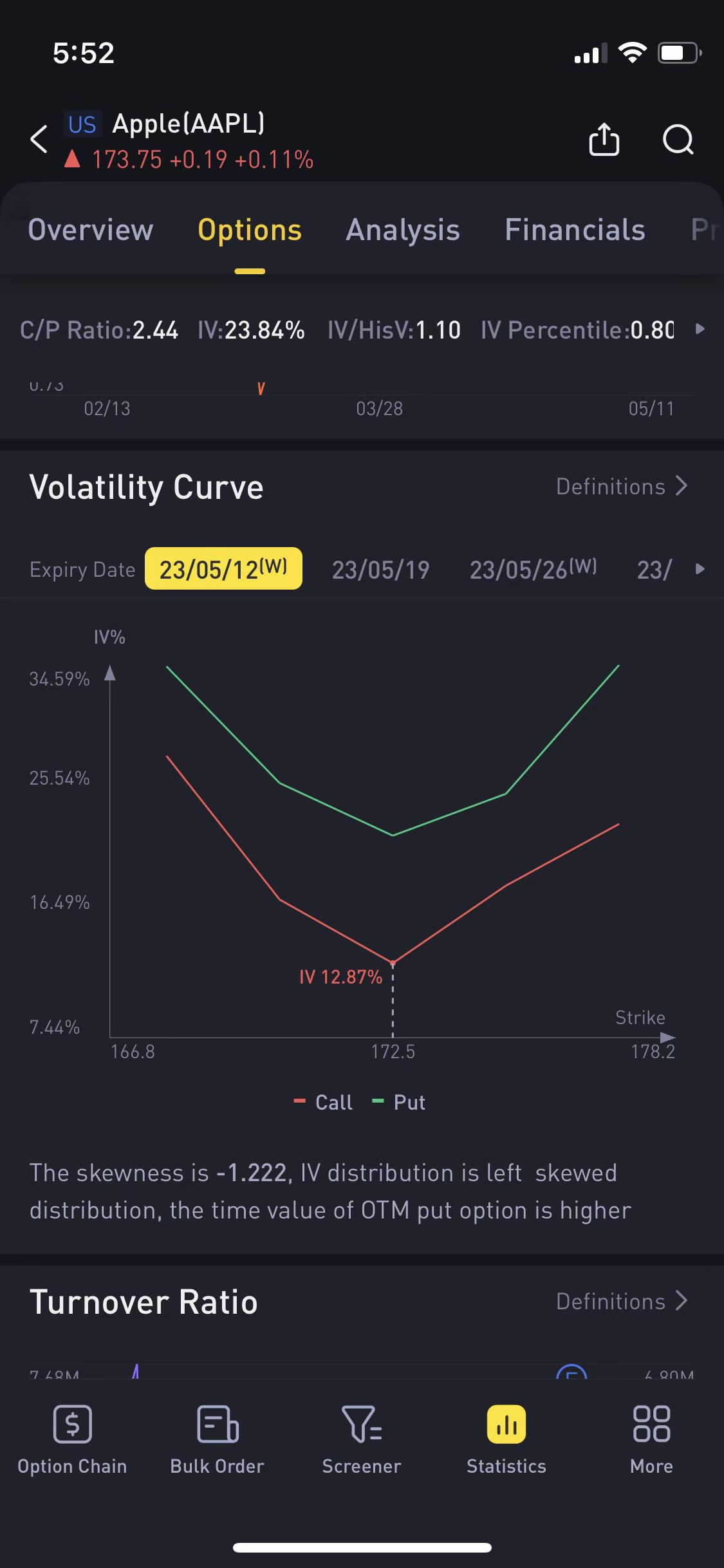 Our app primarily utilizes three indicators for options analysis: Call/Put ratio, Volatility curve, and Turnover ratio. These indicators aid in making investment decisions. To access these three indicators, users need to click on the "Options Analysis" button next to the options chain.