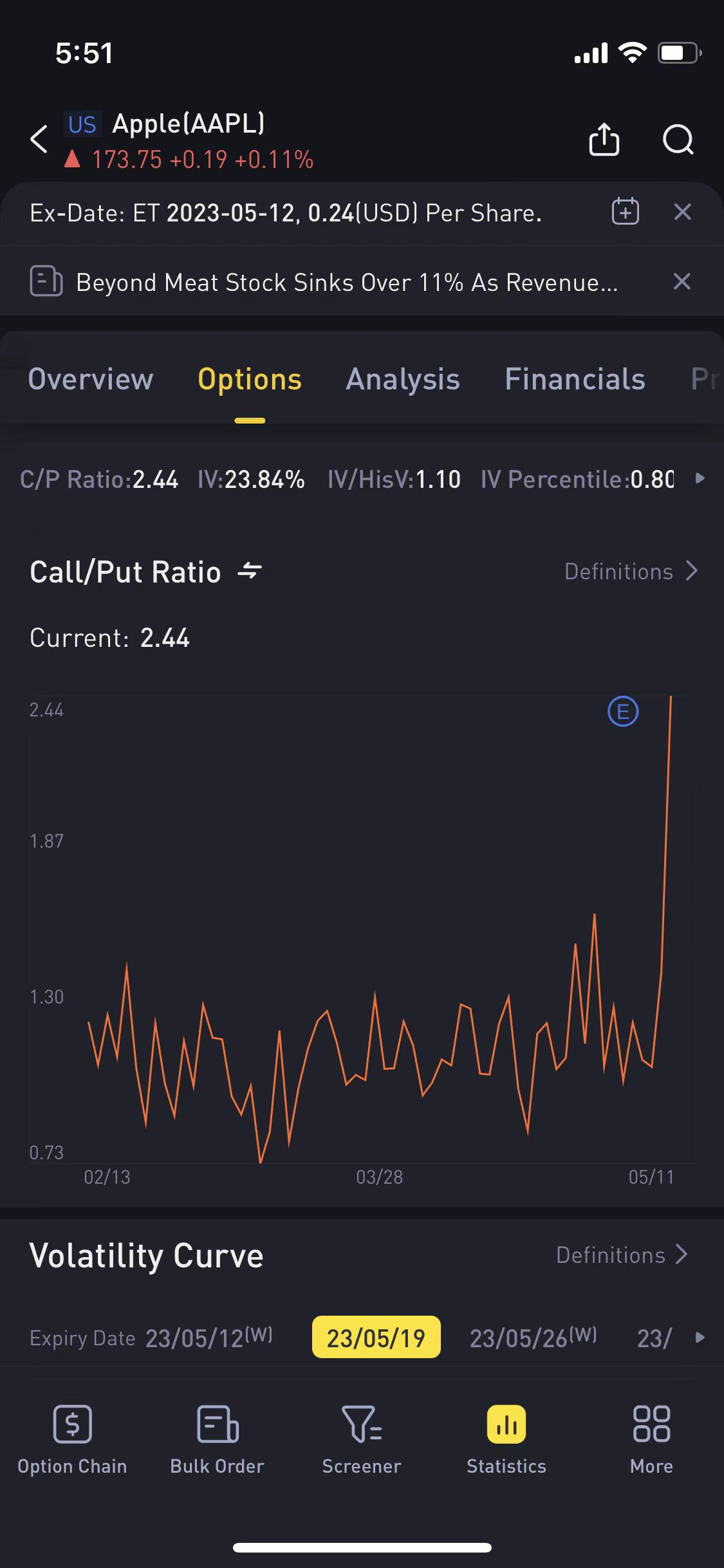 For instance, in the chart up top, Apple Inc.'s Call/Put ratio kept going up and down from Feb 13 to May 11. This means the market's bullish feelings were getting weaker. But after May 11, the ratio started shooting up quickly, showing a shift from weaker bullish sentiment to strong bullish sentiment.