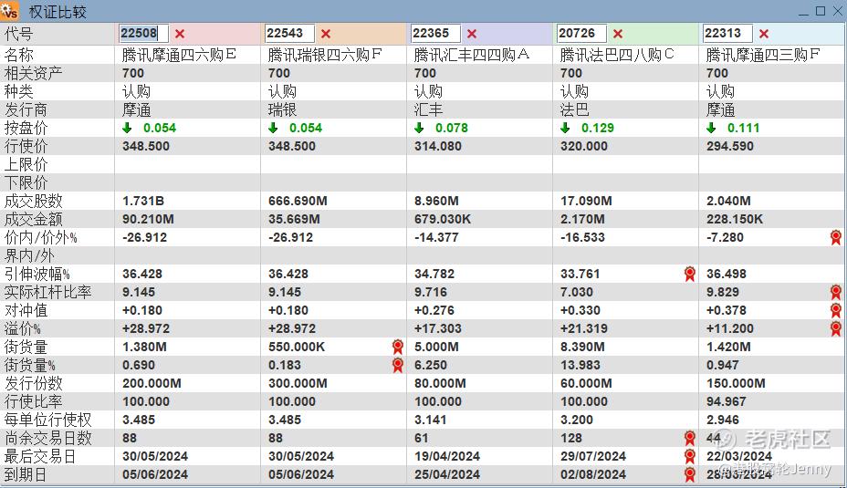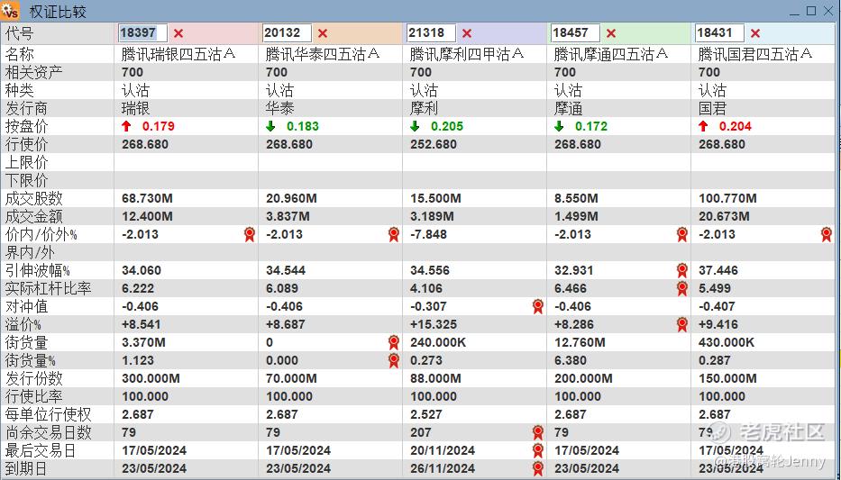 防守性更強的投資者可以考慮阻力位306附近產品。行使價299.8元,2024年5月到期的騰訊認沽證,21410 引伸波幅最低,實際槓桿5.1倍。其次可以考慮21386,引伸波幅34.6%,實際槓桿5.1倍。