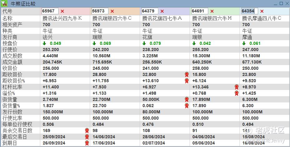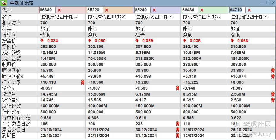 騰訊即市阻力位289。考慮在阻力位附近看淡,行使價275.8,2024年7月到期的認沽證產品,可以考慮22109,引伸波幅最低,實際槓桿4.9倍。其次可以考慮22093,引伸波幅35.5%,實際槓桿4.8倍。